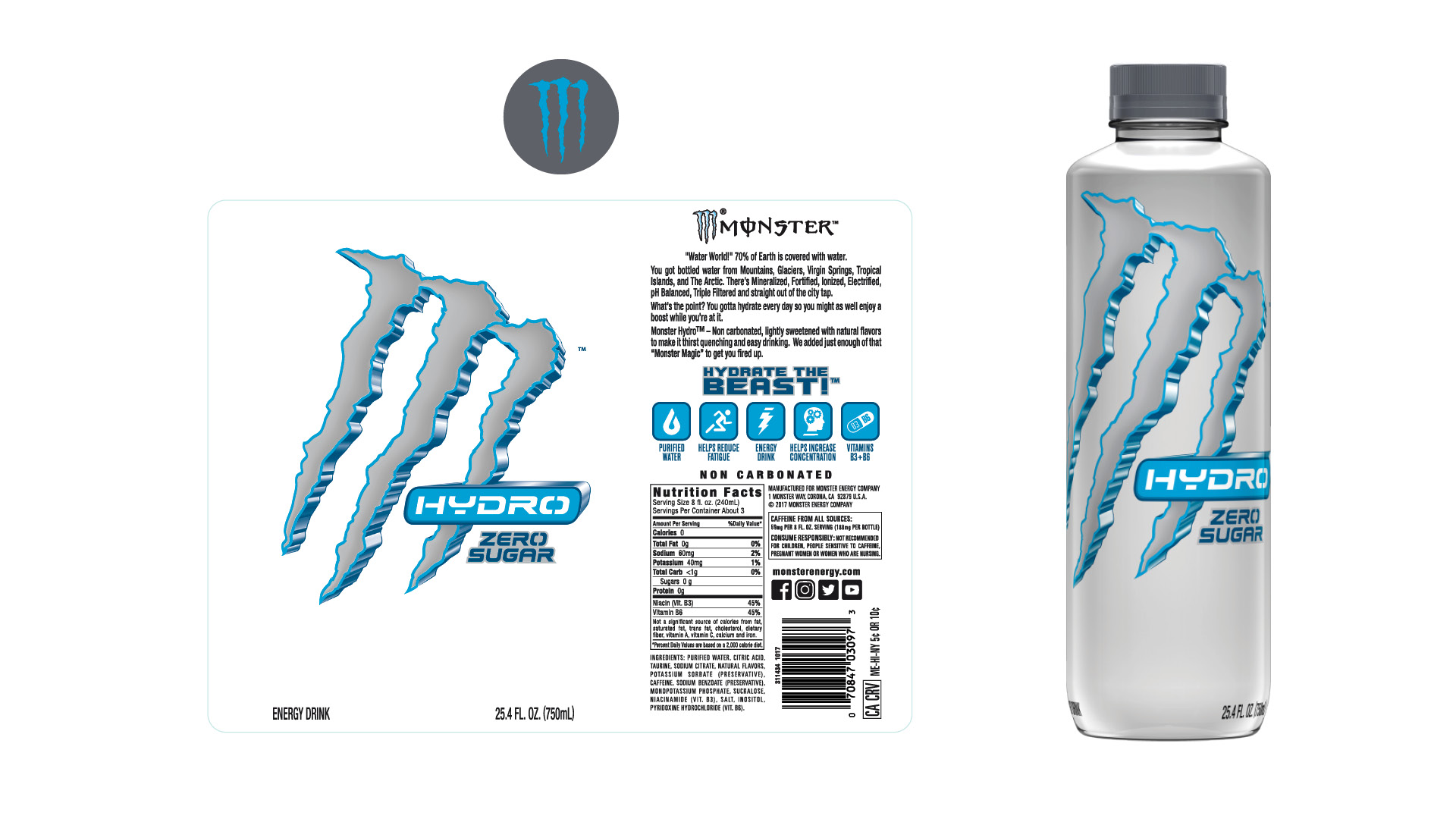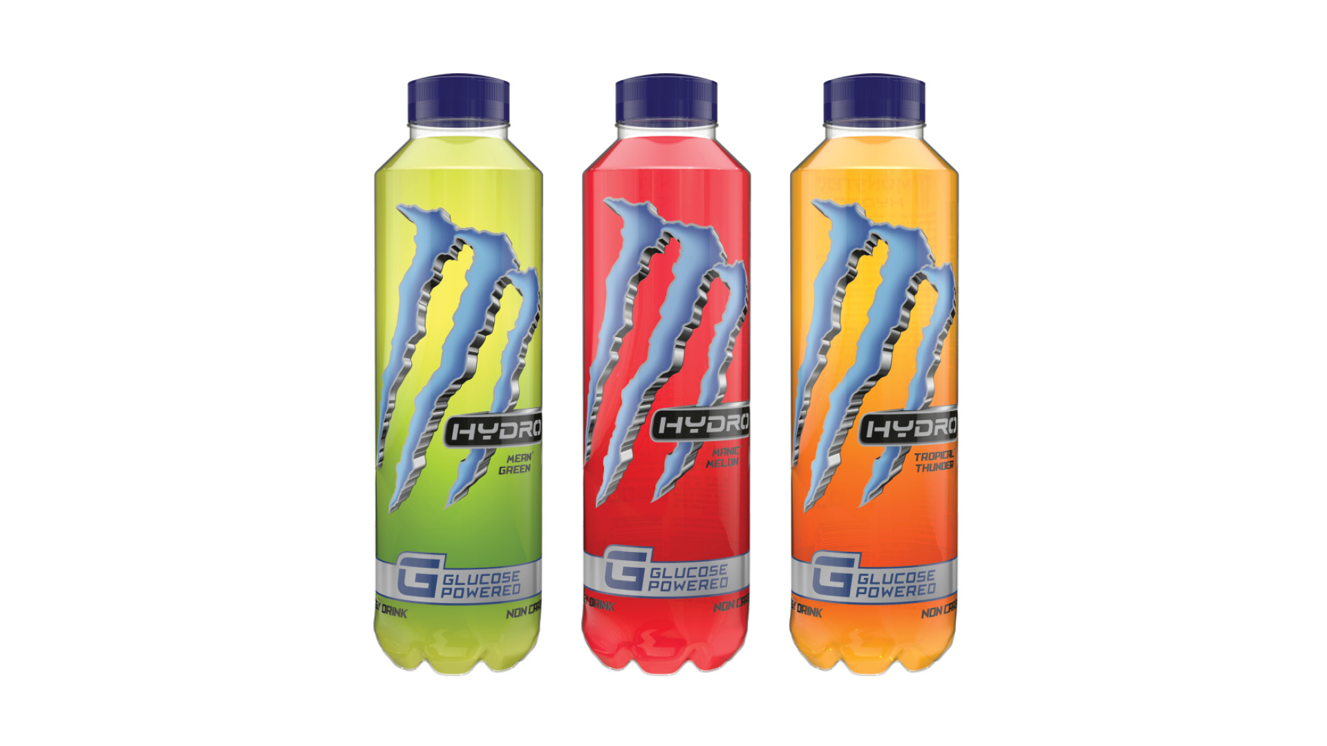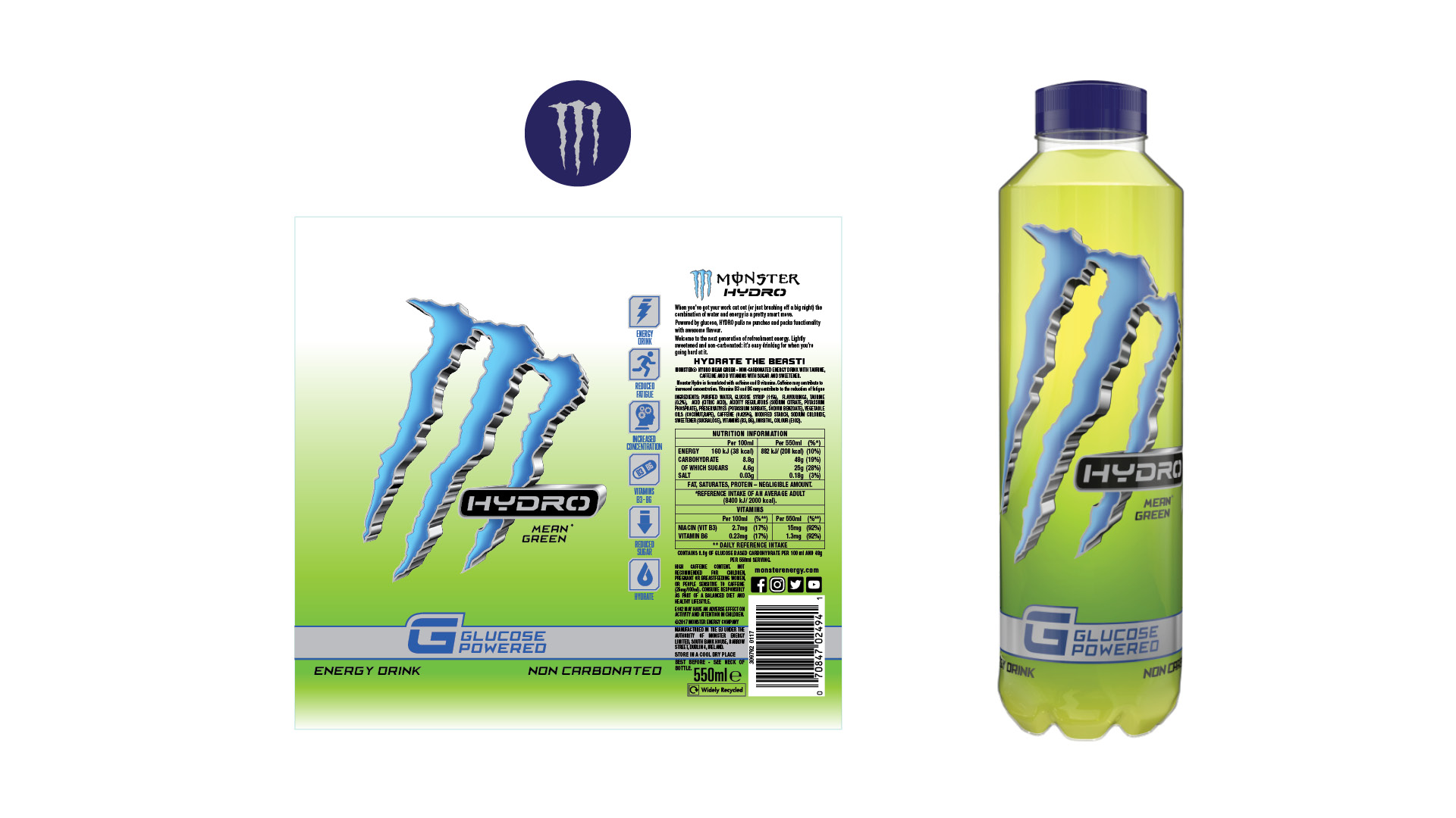 After many rounds of testing different flavors, the innovation team created Monster Hydro. Hydro is a refreshing approachable hydrating energy drink. The Hydro brand utilizes a clear label to showcase the liquid flavor color system. The initial launch was in a unique packaging bottle that mimics an aluminum can but in a clear bottle. The iconic "M" claw changed into a 3D chiseled effect to express movement & endurance. Then transition into resealable bottles that introduced icons on the label designed to emphasize the core benefits of Hydro. The next phase was to create a similar product to fit the UK market with the "Glucose Power" version.