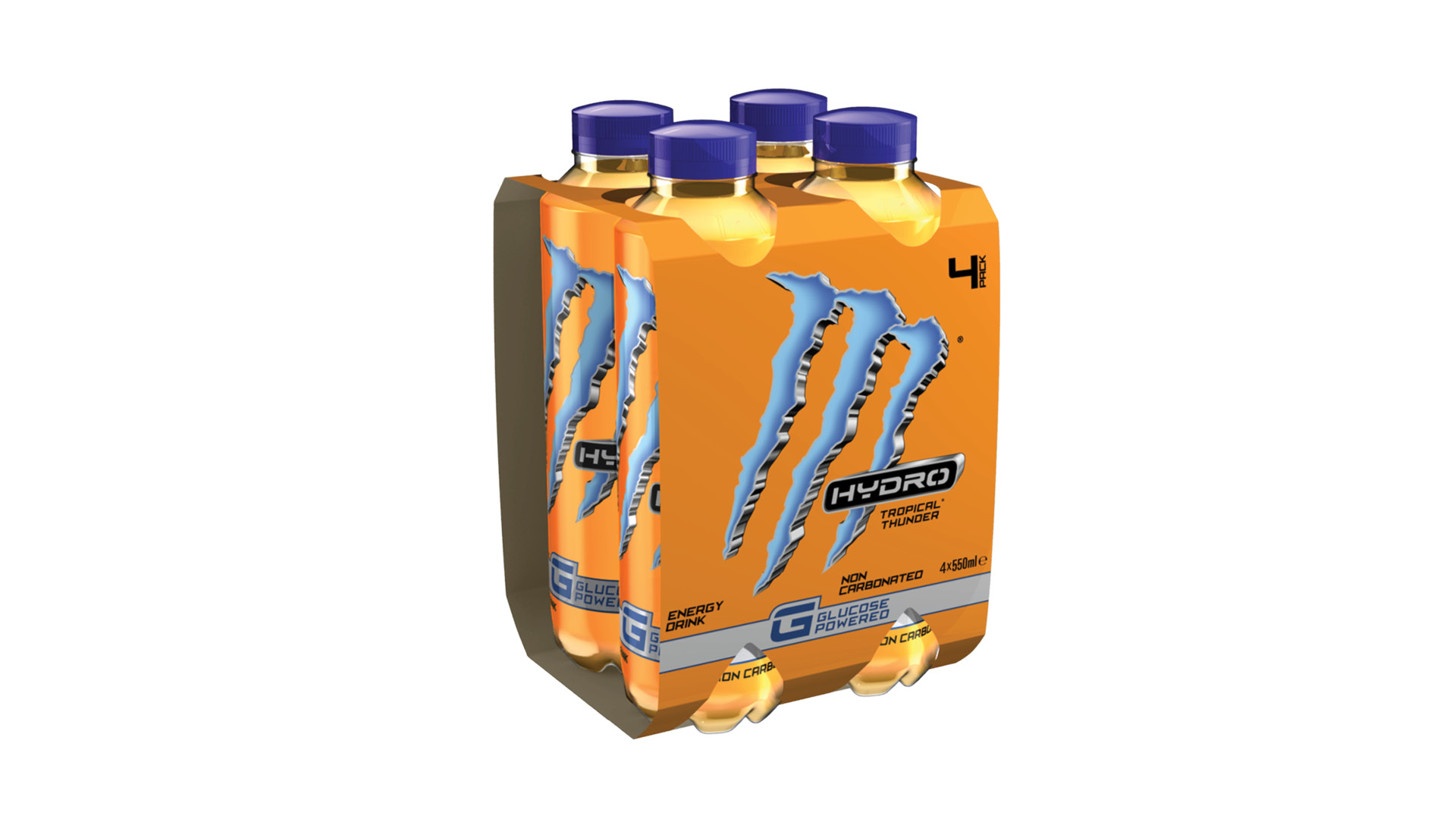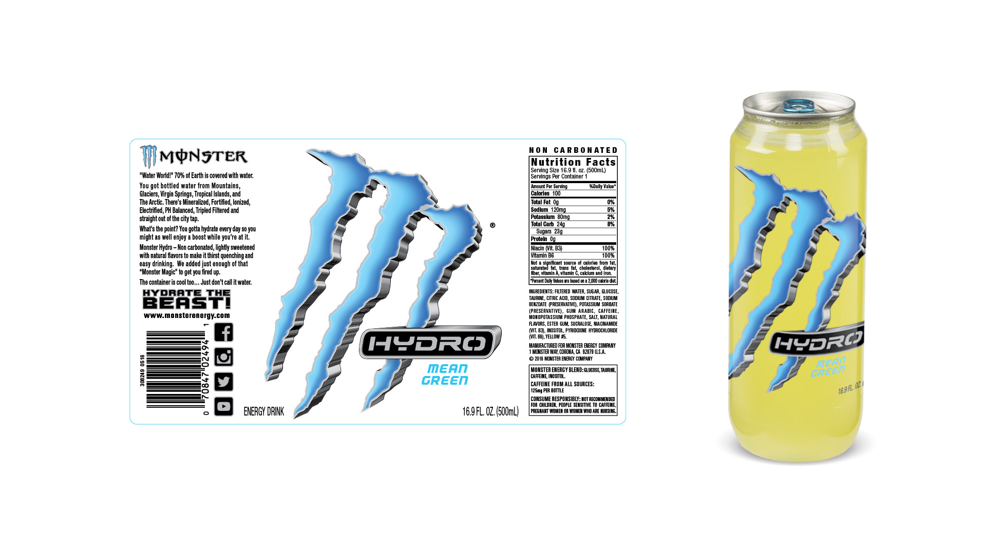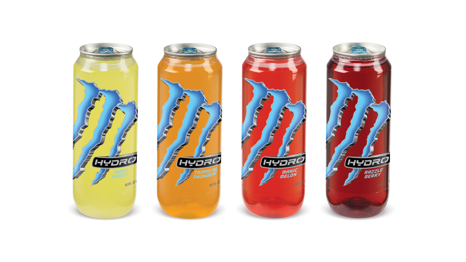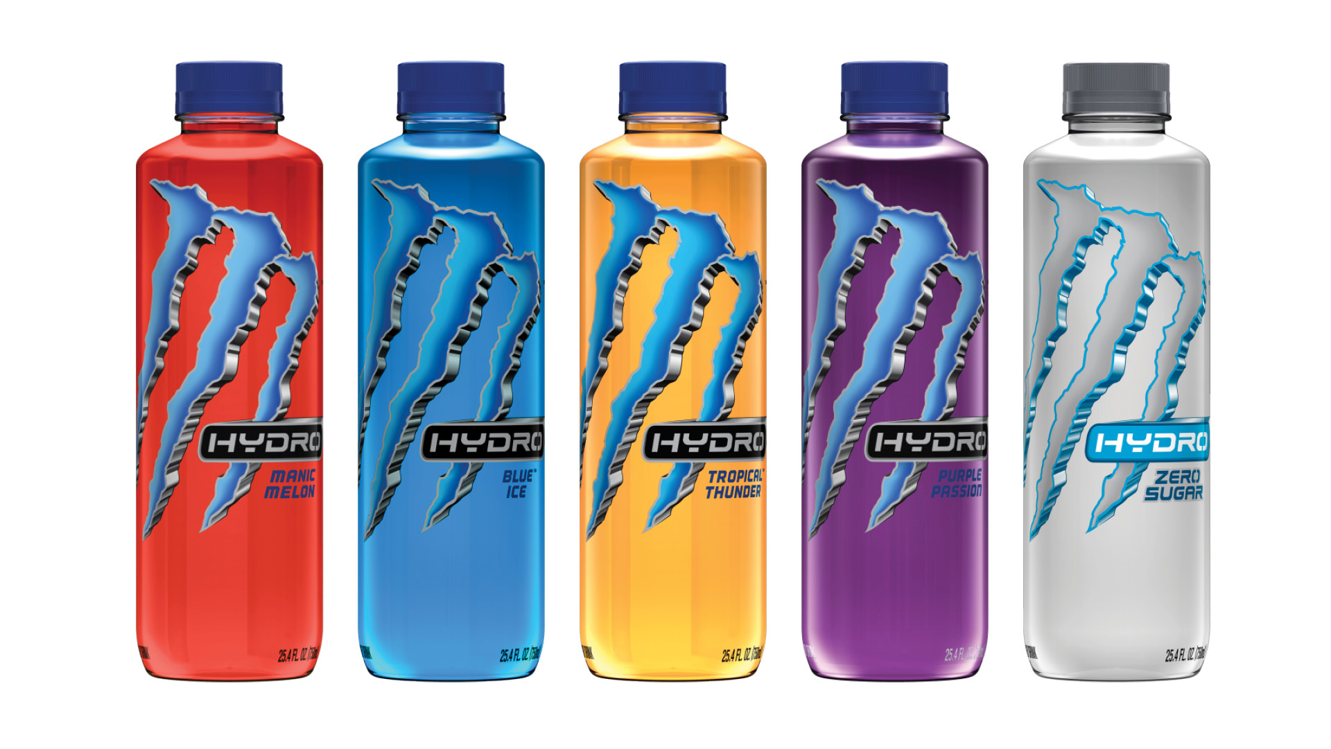 After many rounds of testing different flavors, the innovation team created Monster Hydro. Hydro is a refreshing approachable hydrating energy drink. The Hydro brand utilizes a clear label to showcase the liquid flavor color system. The initial launch was in a unique packaging bottle that mimics an aluminum can but in a clear bottle. The iconic "M" claw changed into a 3D chiseled effect to express movement & endurance. Then transition into resealable bottles that introduced icons on the label designed to emphasize the core benefits of Hydro. The next phase was to create a similar product to fit the UK market with the "Glucose Power" version.