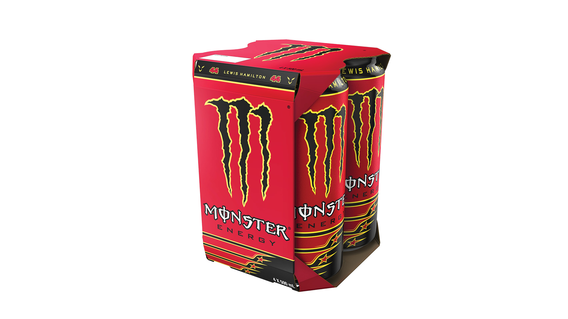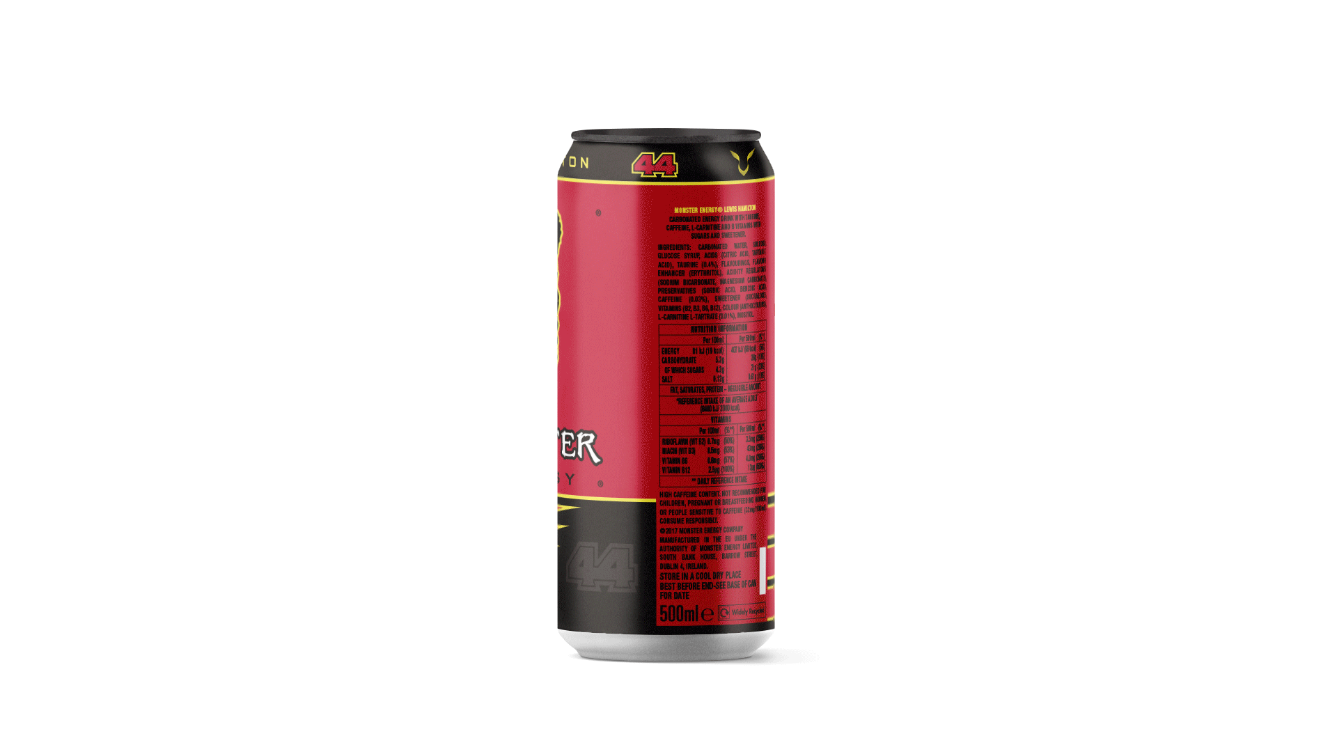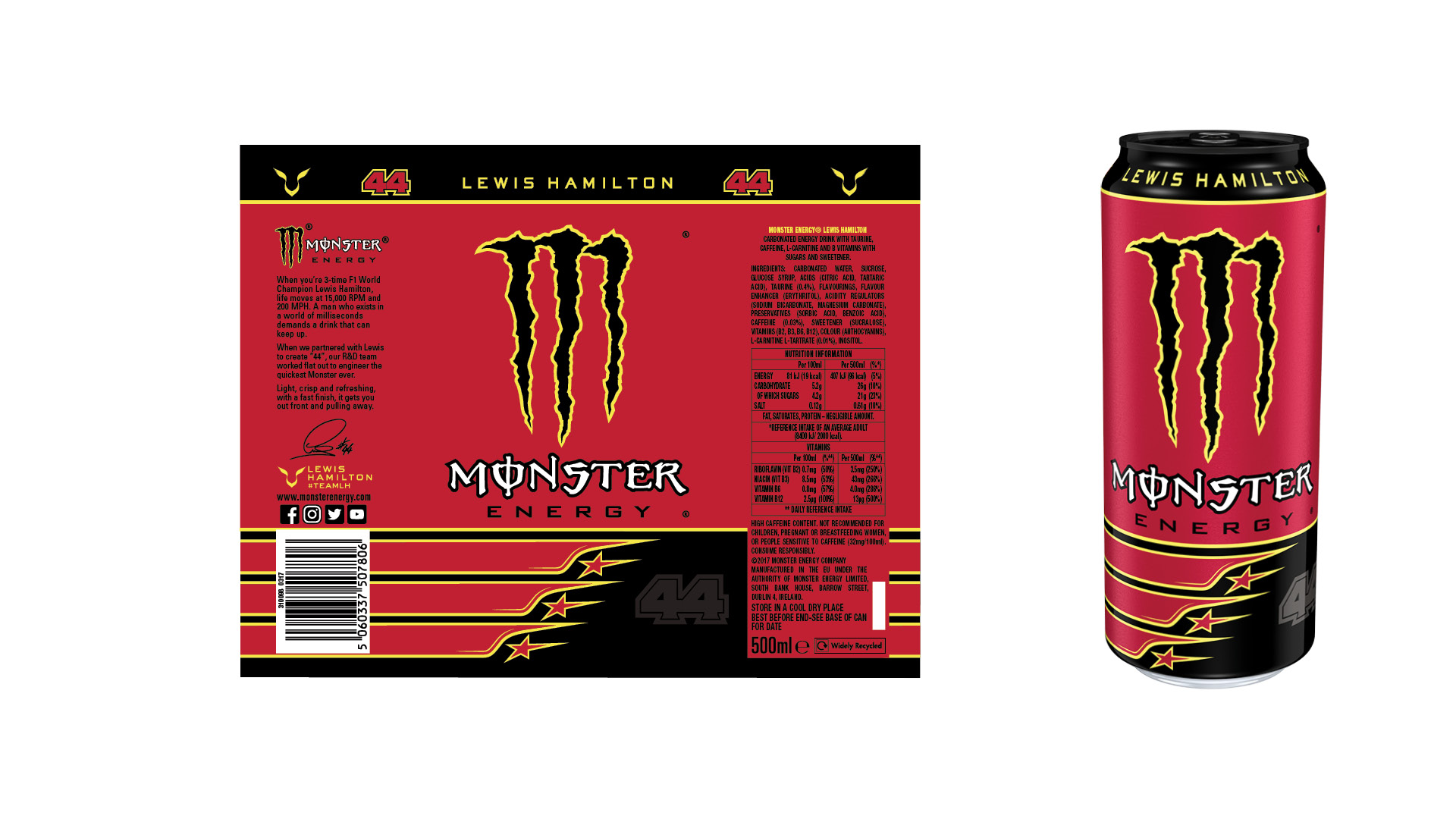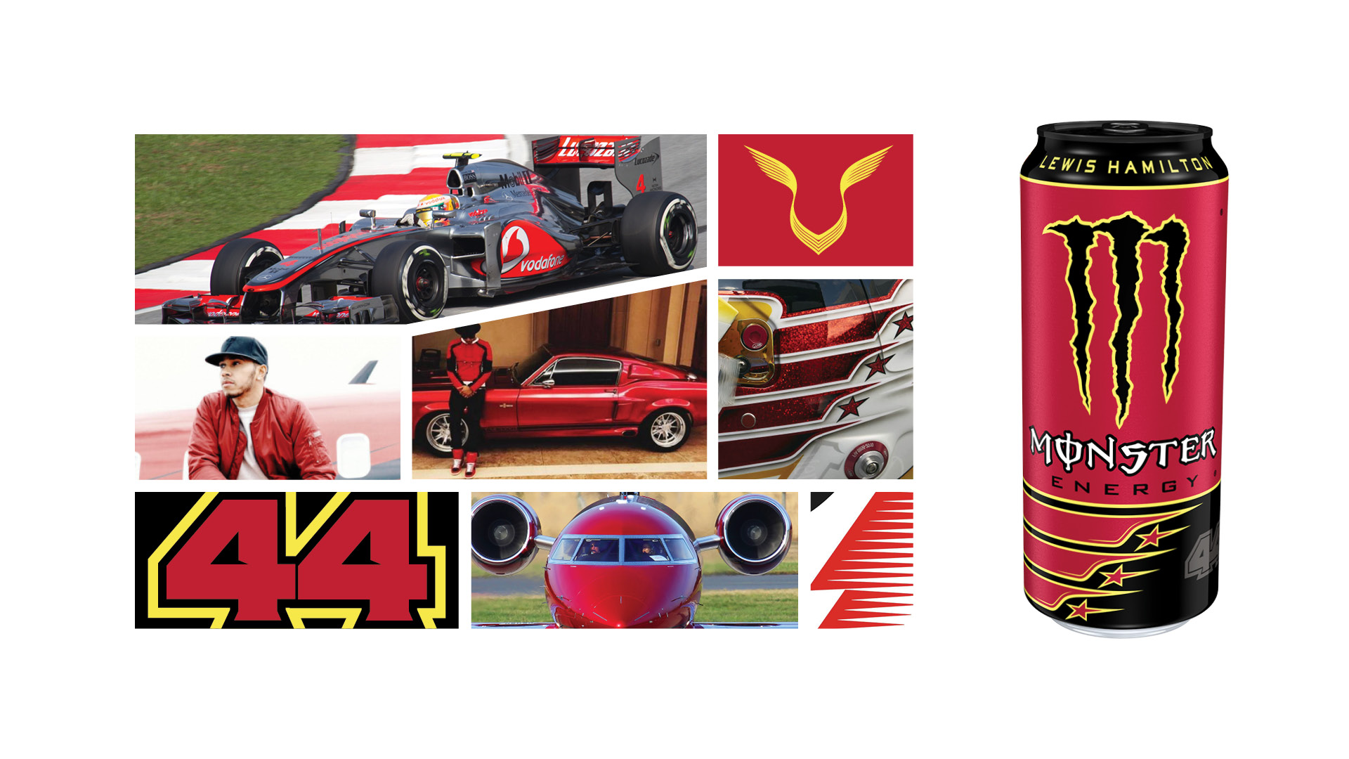 Create an iconic Monster "Lewis Hamilton" signature can. The design needs to be unique enough to stand out and sync with the current Monster family.