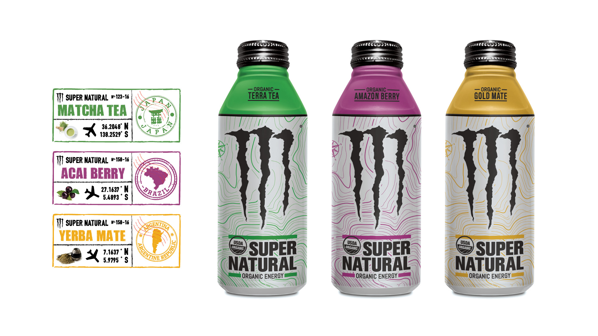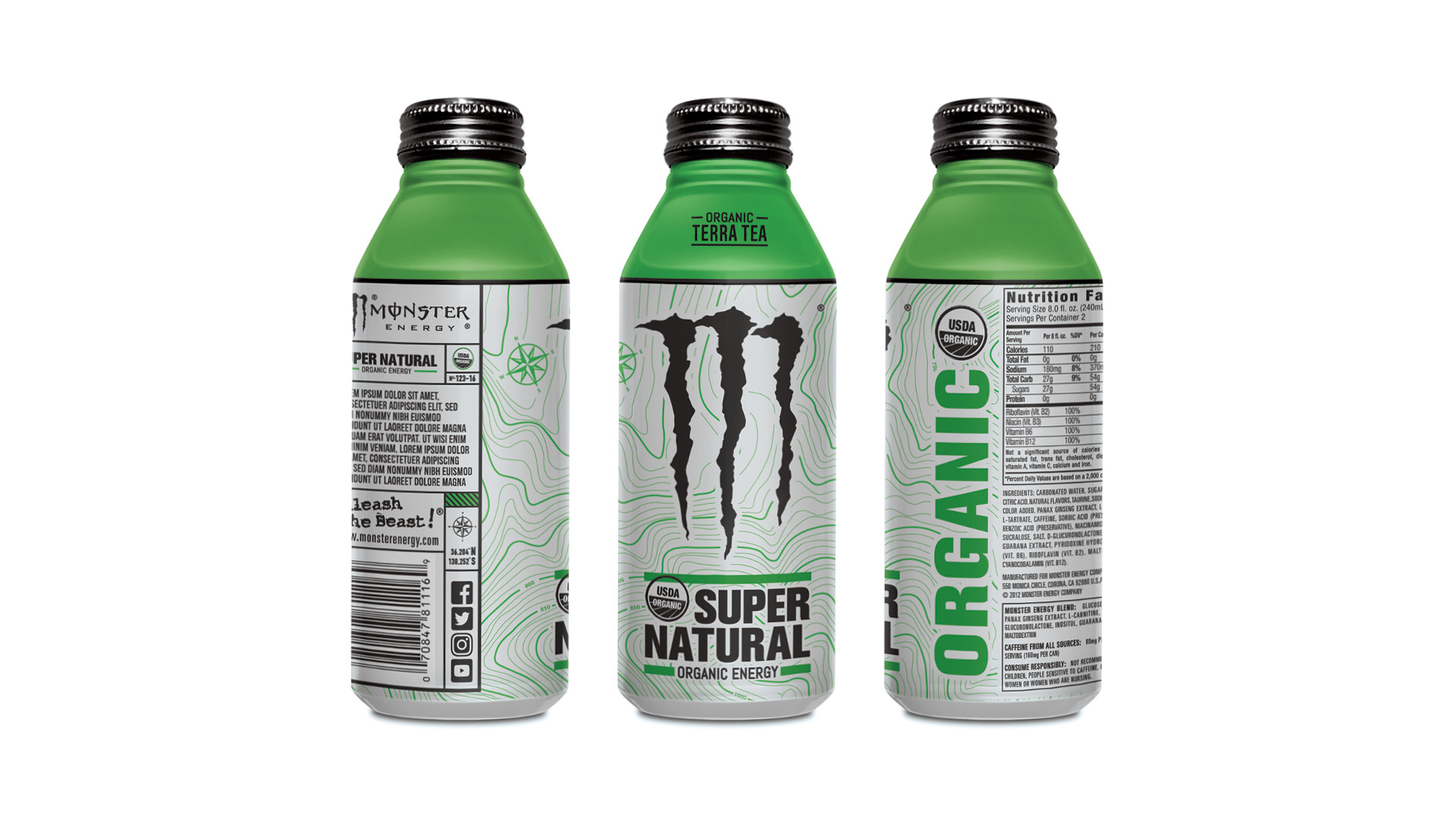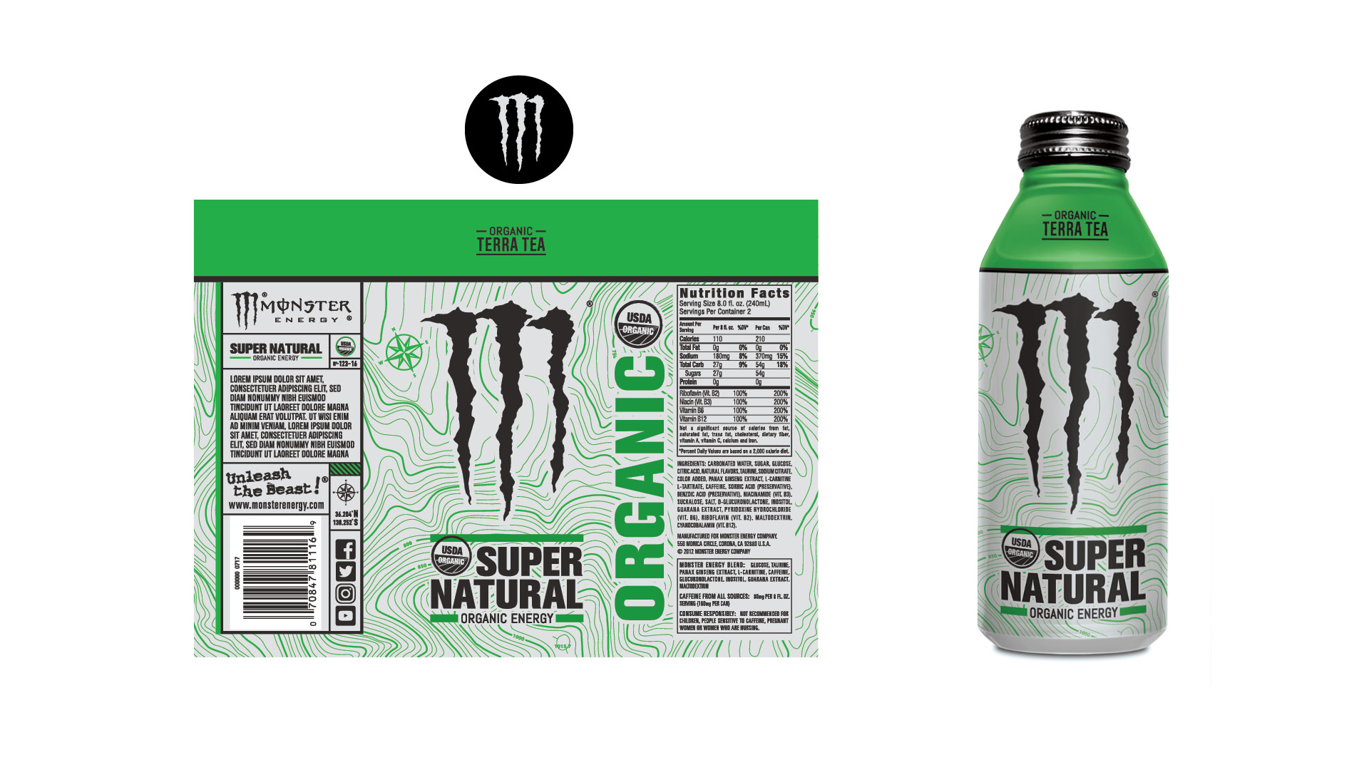 As the times change, Millennials are looking for more natural ingredients in their diet. Monster Super Natural contained a proprietary blend of organic sourced energy. The unique bottle packaging symbolizes a water cantine, made for the consumer who isn't afraid of the outdoors and some adventure. The primary pattern used on the bottle packaging is contour lines usually seen on a map. Symbolic to all the travel needed to source all three flavors from their natural origin.